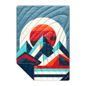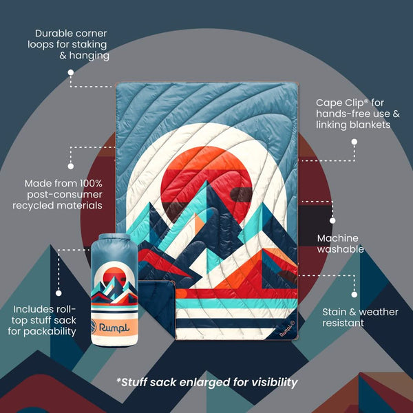 Meet the blanket that launched a brand – the original "blanket for everywhere," Rumpl's most iconic silhouette, and number one bestseller. Now in Radiant Peak Eclipse - watch as bold geometric peaks rise against a glowing sun in hues of blue and red.