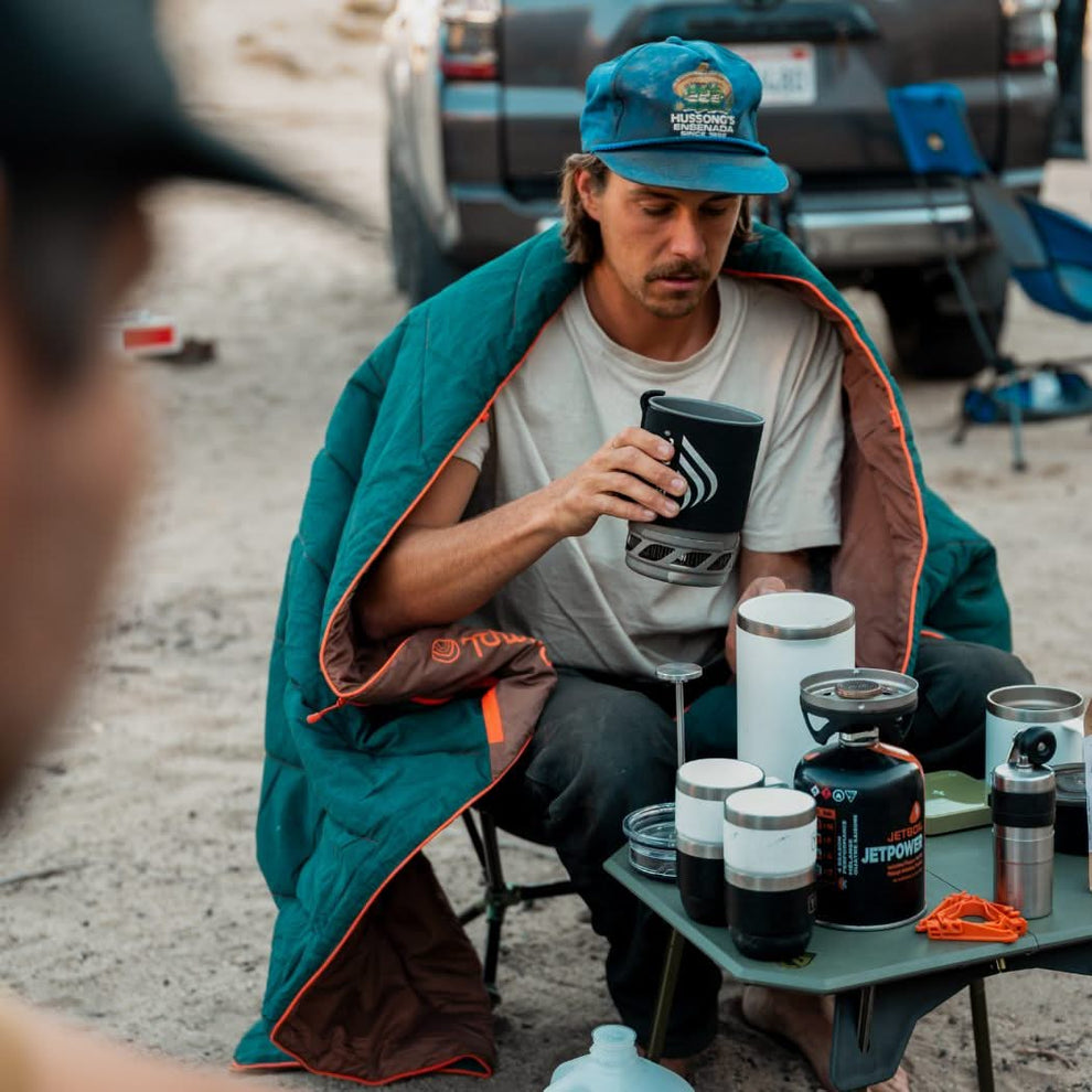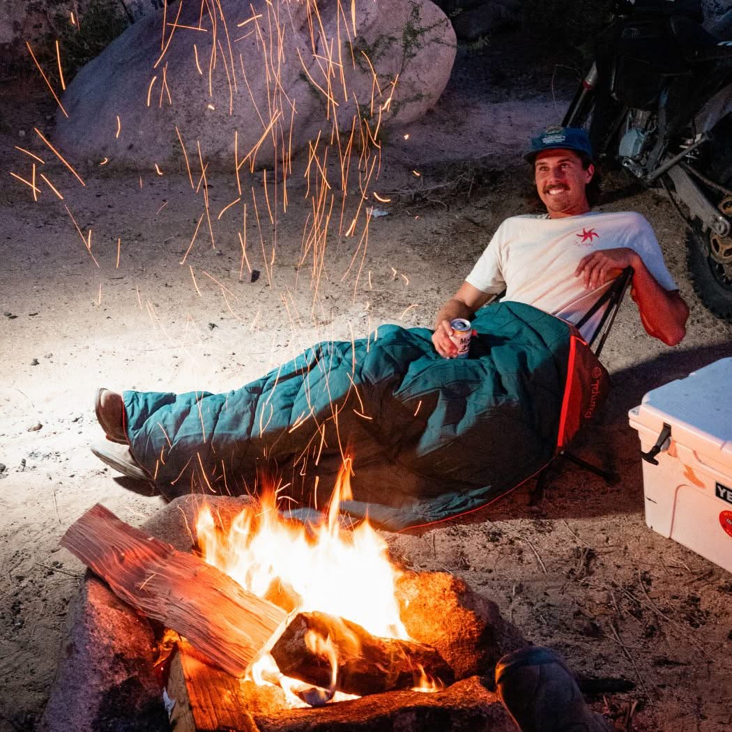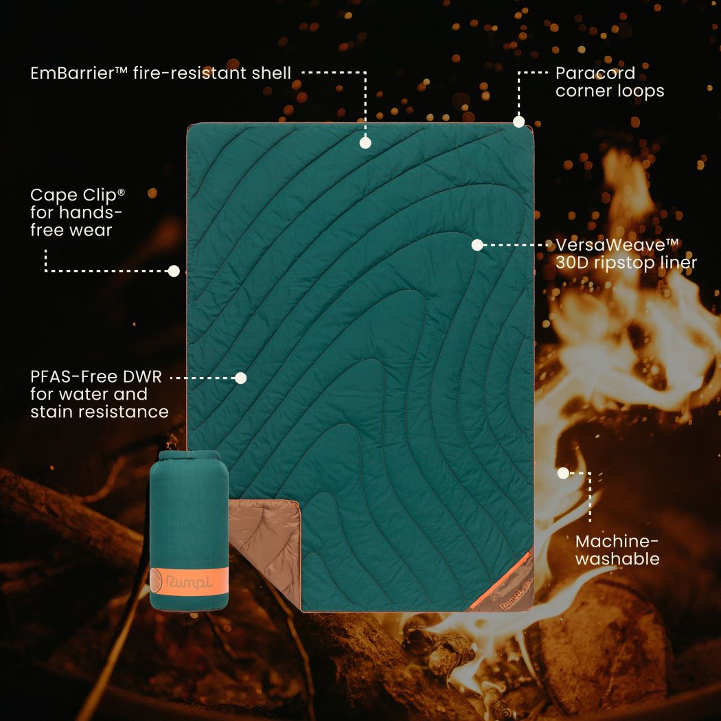Disclaimer: The shell material on the Flame Puffy Blanket is resistant to most sparks and embers, but this product is not flame or fire-resistant. Maintain a safe distance from any open flame at all times.