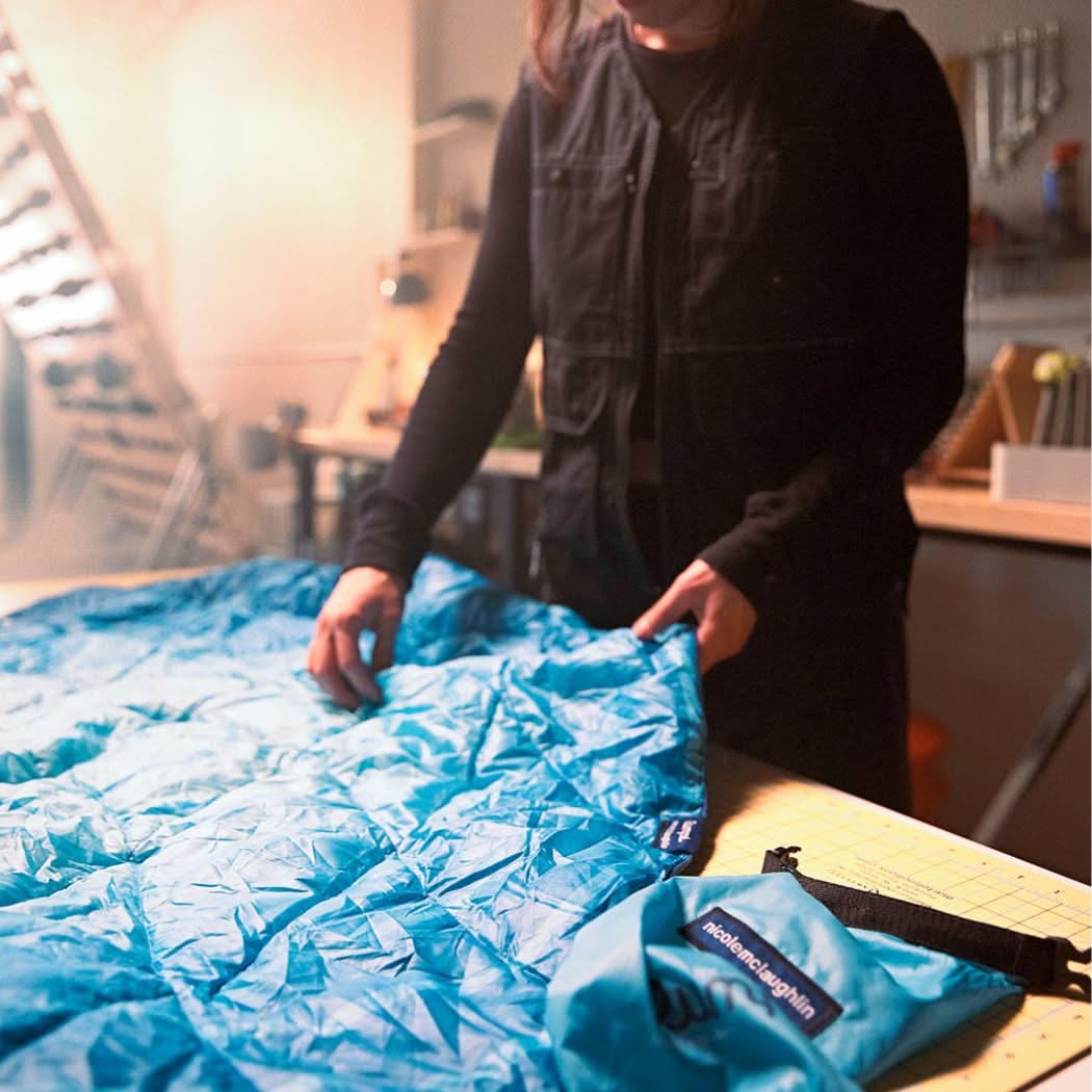 Rae Lang is a Michigan-based woodblock printmaker and the artist behind Woosah, an outdoor lifestyle brand. Blending hand-carved prints with digital color, Rae channels Great Lakes wilderness into bold, tactile artwork - now reimagined on Rumpl blankets to help keep the places that inspire them wild.