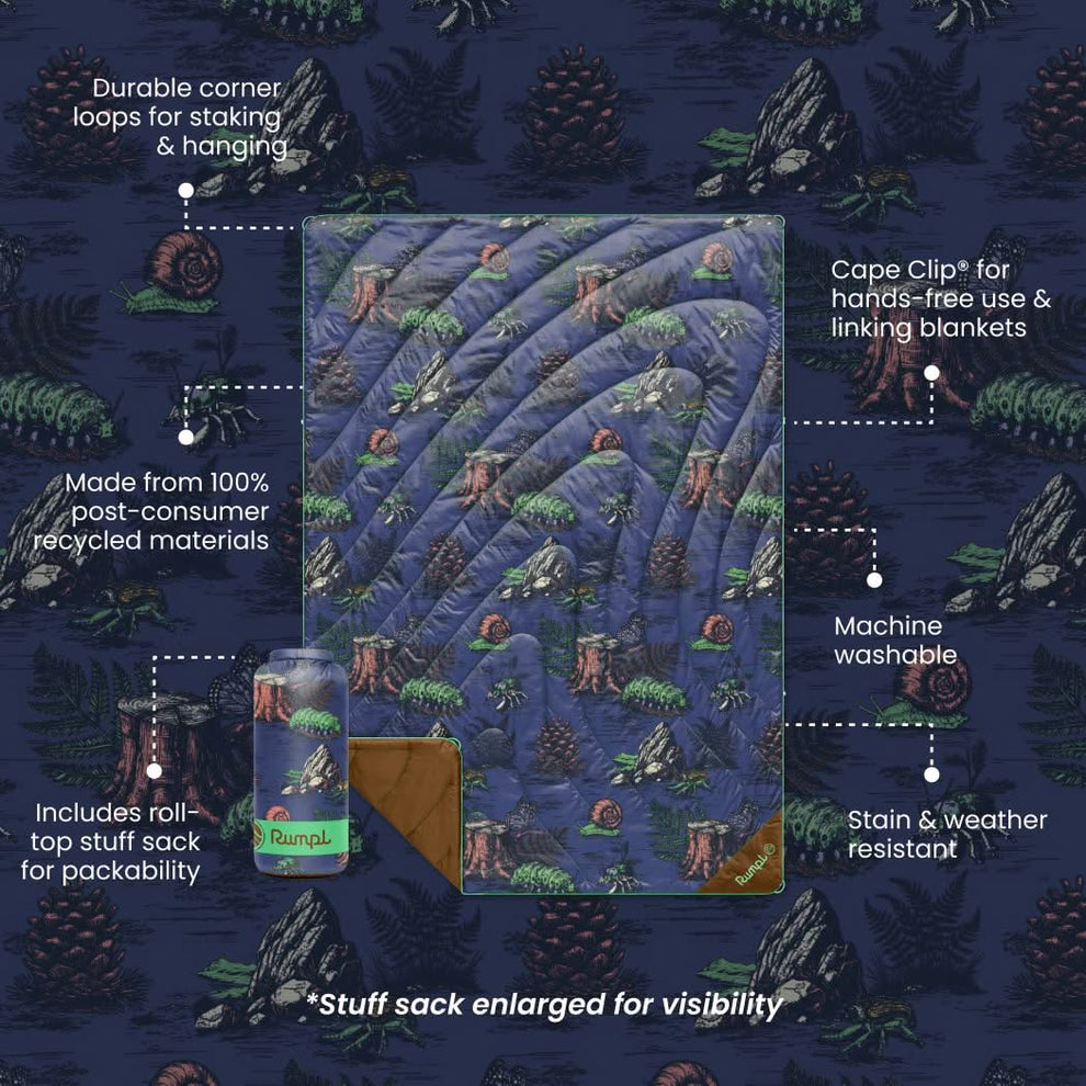 Meet the blanket that launched a brand – the original "blanket for everywhere," Rumpl's most iconic silhouette, and number one bestseller. Now in our Forest Floor print - Designed for slow roamers and stump sitters, this print captures the quiet, unnoticed and unbothered beauty of the forest's lively floor.