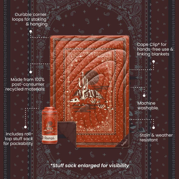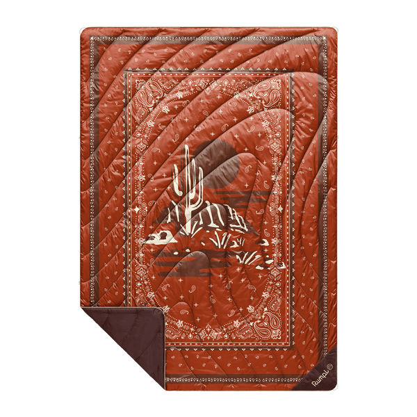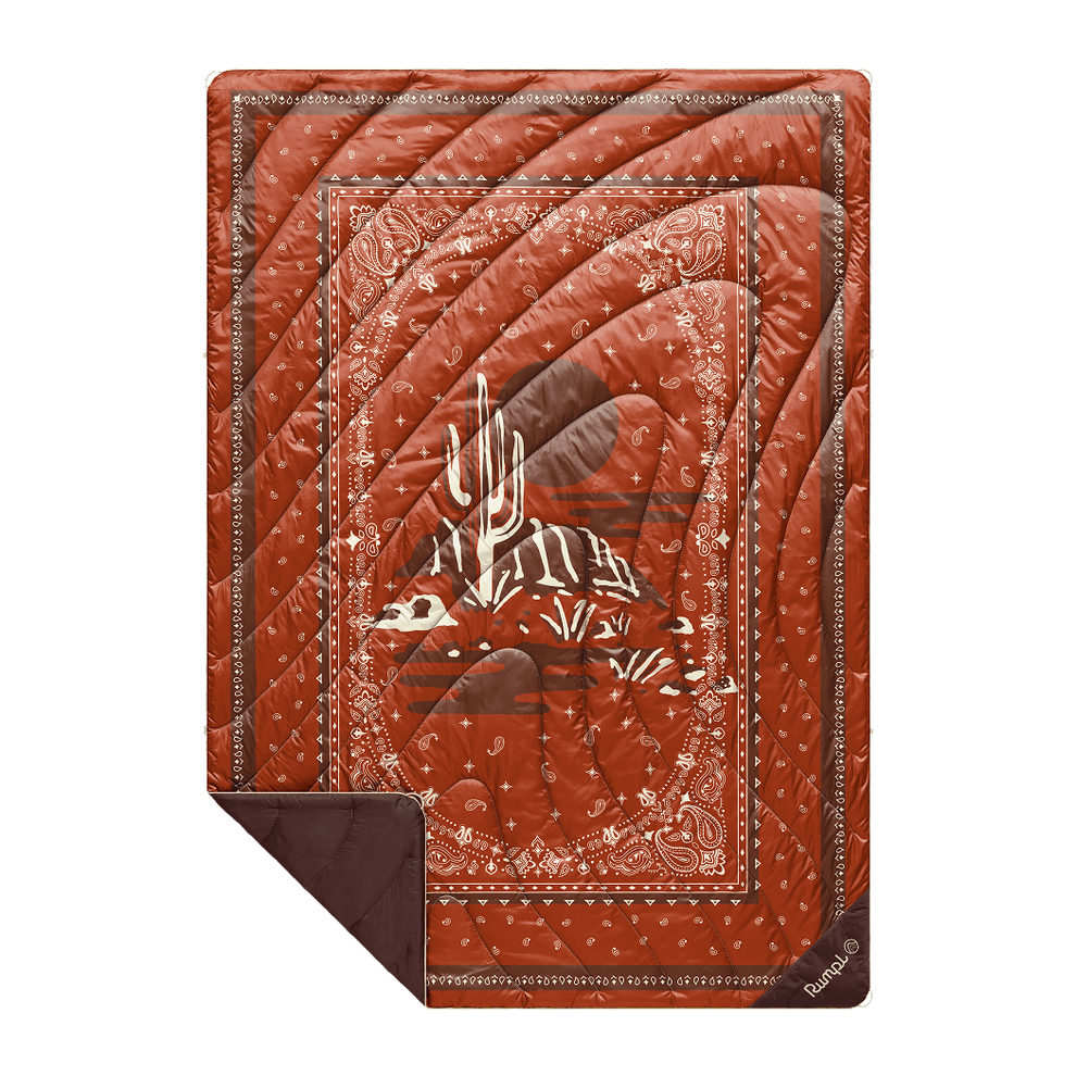 Meet the blanket that launched a brand – the original "blanket for everywhere," Rumpl's most iconic silhouette, and number one bestseller. Now in our Sedona Saguaro Bandana print - Featuring a classic bandana pattern with western motifs in rich orange and burnt red.